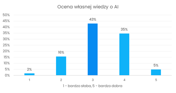 Na początku badania ankietowani zostali poproszeni o samoocenę swojej wiedzy na temat sztucznej inteligencji. Największa grupa respondentów (43%) określiła ją jako przeciętną. Najmniejszy odsetek studentów wskazał na bardzo słabą znajomość AI. Średnia ocena wiedzy studentów UEW na temat sztucznej inteligencji wyniosła 3,26 w pięciostopniowej skali, co potwierdza, że większość badanych ocenia swoje kompetencje w tym obszarze jako umiarkowane.