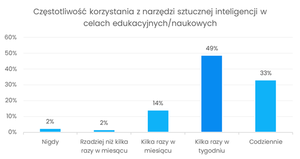 Kolejna część ankiety dotyczyła częstotliwości wykorzystywania narzędzi AI w celach edukacyjnych. Z odpowiedzi wynika, że znaczna część studentów korzysta z AI kilka razy w tygodniu lub nawet codziennie. Posługiwanie się sztuczną inteligencją w procesie nauki staje się więc coraz bardziej powszechne. Warto jednak zauważyć, że niewielka grupa respondentów zadeklarowała, że nie korzysta z takich narzędzi wcale.