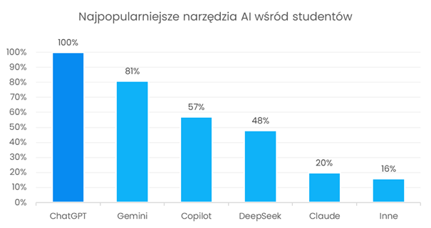 W badaniu zapytano również o narzędzia AI, z którymi studenci mieli do tej pory styczność. Wszyscy ankietowani wskazali ChatGPT jako znane im rozwiązanie. Kolejne miejsca zajęły Gemini, Copilot, DeepSeek oraz Claude. W odpowiedziach otwartych pojawiały się także inne narzędzia, takie jak Bielik, Perplexity, Grok czy Sona. Przeciętnie studenci UEW deklarowali znajomość około trzech narzędzi AI, co potwierdza, że kontakt ze sztuczną inteligencją nie ogranicza się już do jednego rozwiązania. Wyniki pokazują, że studenci UEW korzystają z szerokiej gamy narzędzi opartych na sztucznej inteligencji, a rynek tych rozwiązań jest im coraz lepiej znany.