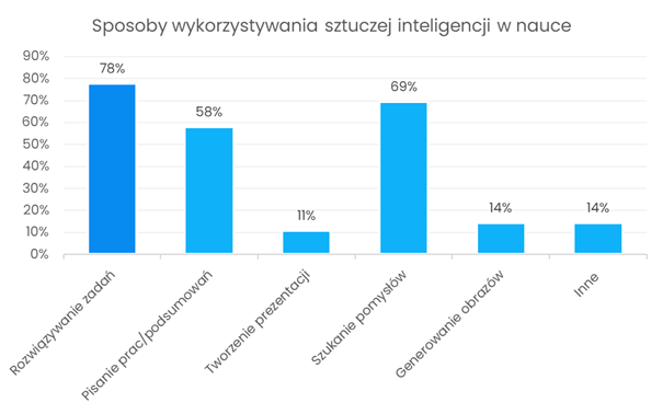 Najczęściej wskazywanym zastosowaniem AI było rozwiązywanie zadań. Na kolejnych miejscach znalazły się: szukanie pomysłów oraz pisanie prac i podsumowań. Studenci wykorzystywali również AI do wyjaśniania trudnych zagadnień, porządkowania materiału czy planowania nauki. Odpowiedzi te pokazują, że sztuczna inteligencja pełni dla studentów przede wszystkim rolę narzędzia wspierającego proces uczenia się.