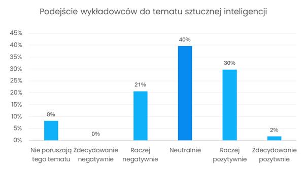 Zapytano również o to, jak – zdaniem studentów – wykładowcy odnoszą się do tematu AI. Ankietowani wskazywali najczęściej na neutralne lub raczej pozytywne podejście prowadzących. Żaden z respondentów nie zaznaczył odpowiedzi „zdecydowanie negatywnie”. Można zatem zauważyć, że wykładowcy w większości unikają skrajnych ocen, co może sprzyjać otwartej dyskusji na temat wykorzystania AI w edukacji.