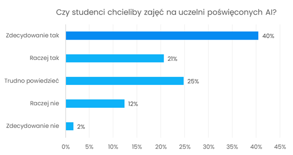 Większość studentów opowiada się także za wprowadzeniem zajęć poświęconych sztucznej inteligencji na uczelni. Około co czwarty respondent nie potrafił jednoznacznie określić swojego stanowiska, natomiast około 15% badanych było przeciwnego zdania.