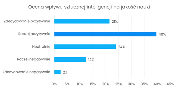 Większość ankietowanych oceniła wpływ sztucznej inteligencji na jakość nauki jako pozytywny. Około jedna czwarta respondentów zajęła, wobec tego tematu neutralne stanowisko. Wyniki te sugerują, że studenci w dużej mierze postrzegają AI jako pomocne wsparcie edukacyjne, choć część z nich podchodzi do tego zagadnienia z ostrożnością.