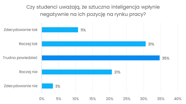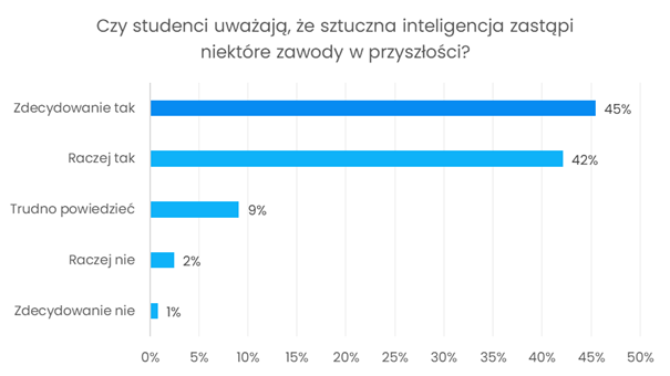 W ankiecie pojawiły się również pytania dotyczące przyszłości związanej z rozwojem sztucznej inteligencji. Prawie 90% respondentów uważa, że AI zastąpi niektóre zawody. Jednocześnie znaczna część studentów dostrzega możliwość negatywnego wpływu AI na swoją przyszłą pozycję na rynku pracy, choć wielu ankietowanych nie potrafiło jednoznacznie określić swojego stanowiska w tej kwestii. Wyniki te pokazują, że obok entuzjazmu wobec AI pojawiają się także obawy i niepewność.
